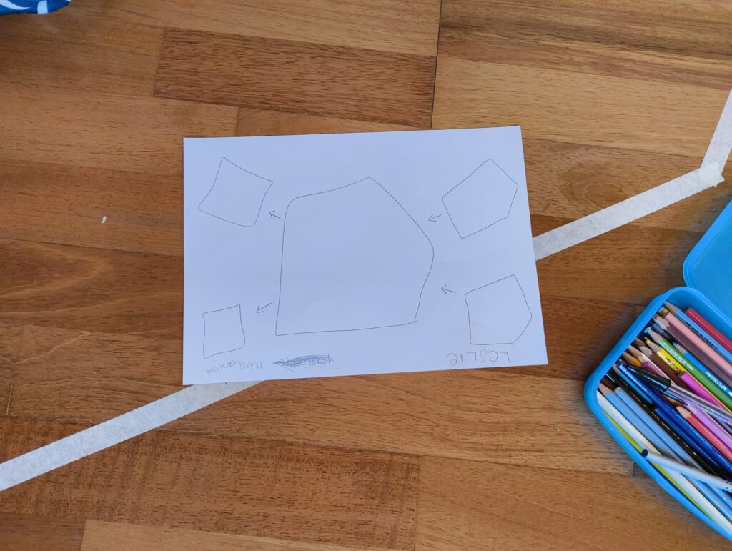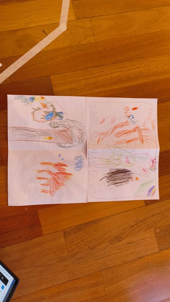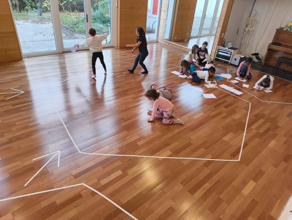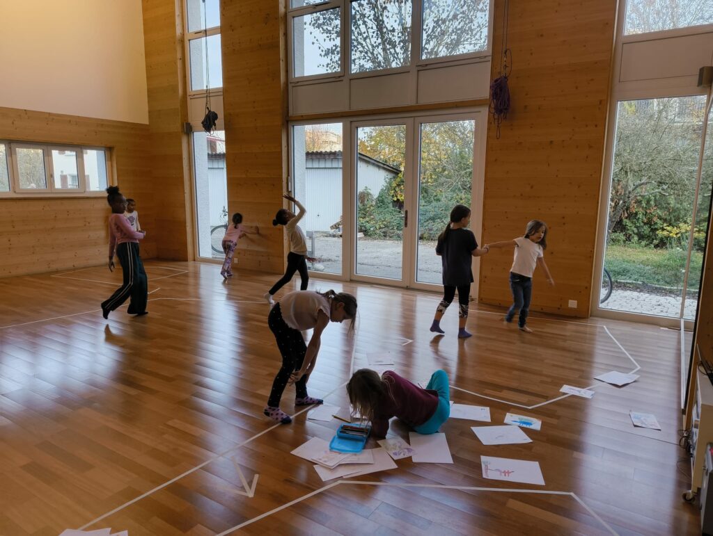 Lien entre narration et espace : Les enfants structure leur espace de narration sur la feuille comme l’espace dans lequel ils danseront ensuite.